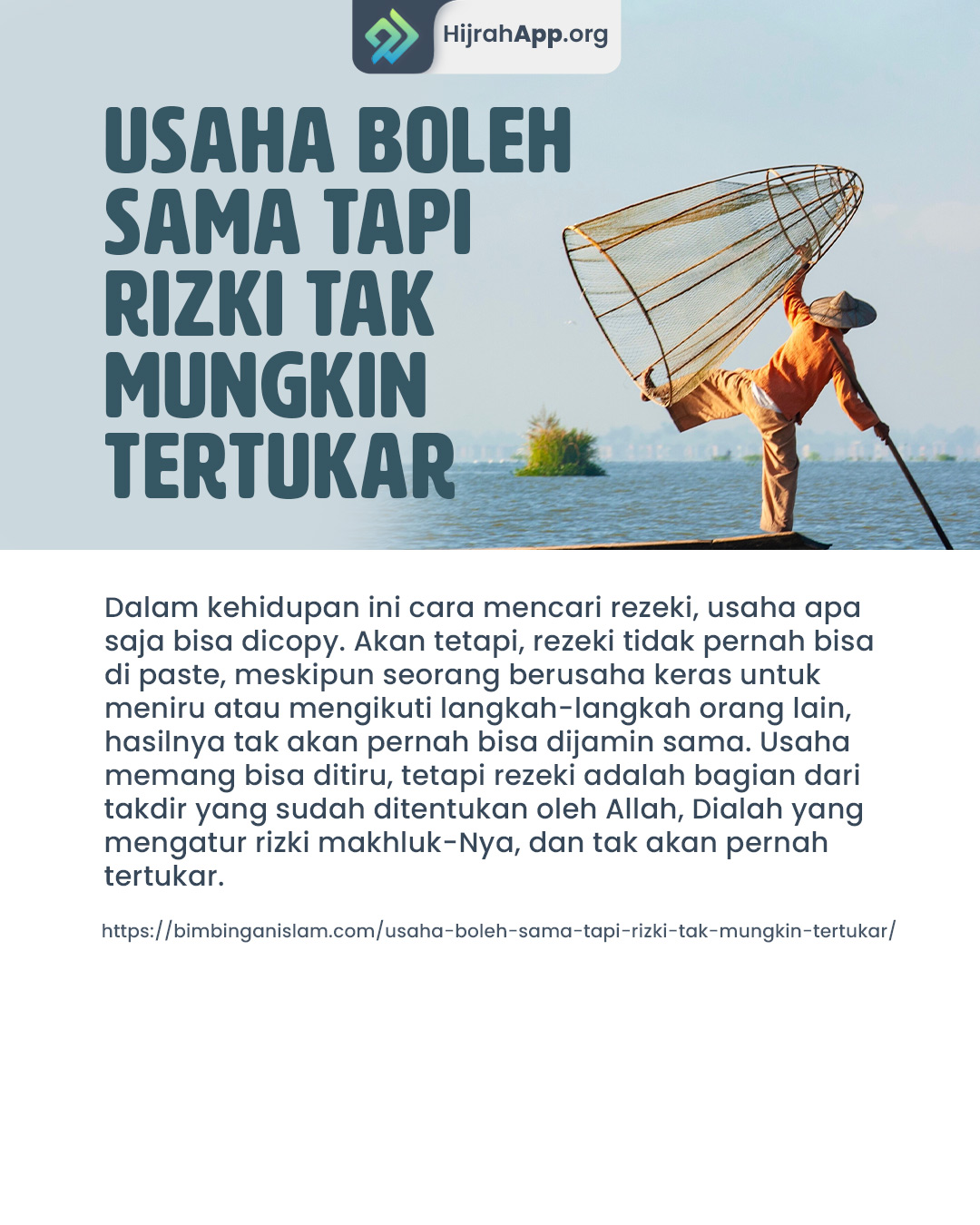 sumber : https://bimbinganislam.com/usaha-boleh-sama-tapi-rizki-tak-mungkin-tertukar/