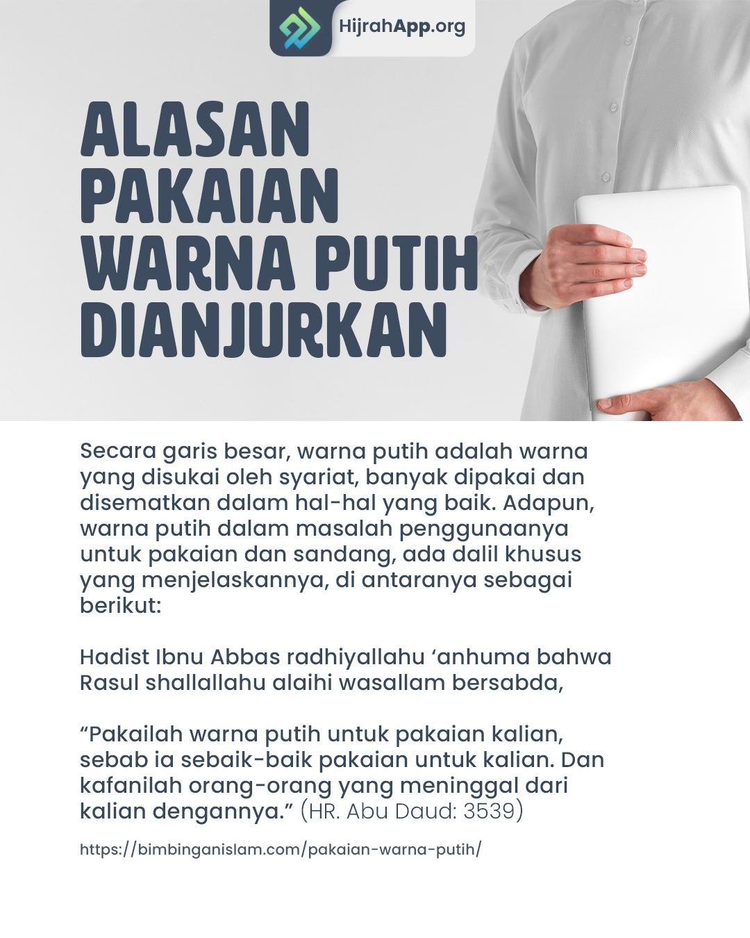 Secara garis besar, warna putih adalah warna yang disukai oleh syariat, banyak dipakai dan disematkan dalam hal-hal yang baik. Adapun, warna putih dalam masalah penggunaanya untuk pakaian dan sandang, ada dalil khusus yang menjelaskannya, di antaranya sebagai berikut: