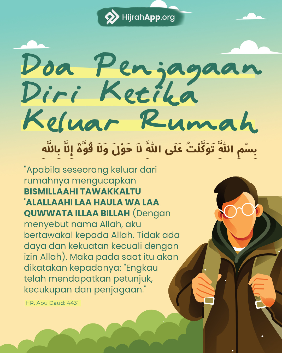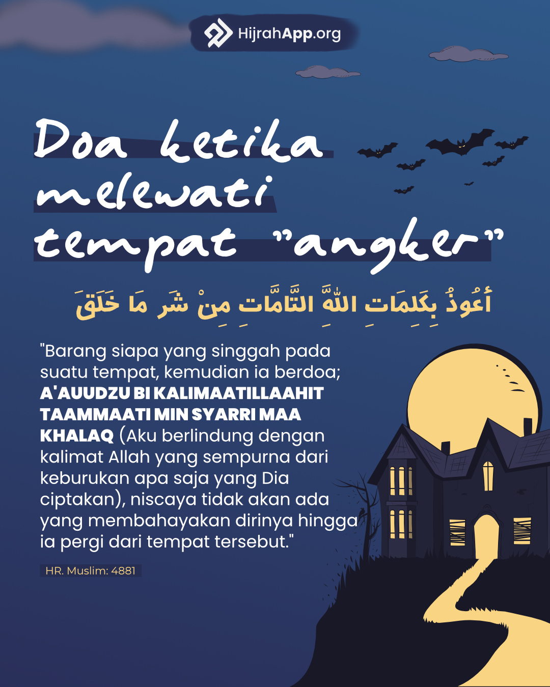 “Barangsiapa yang singgah di suatu tempat lantas ia mengucapkan “a’udzu bi kalimaatillahit taammaati min syarri maa kholaq” (Aku berlindung dengan kalimat-kalimat Allah yang sempurna dari kejahatan makhluk yang diciptakanNya)”, maka tidak ada sama sekali yang dapat memudhorotkannya sampai ia berpindah dari tempat tersebut” (HR. Muslim no. 2708).