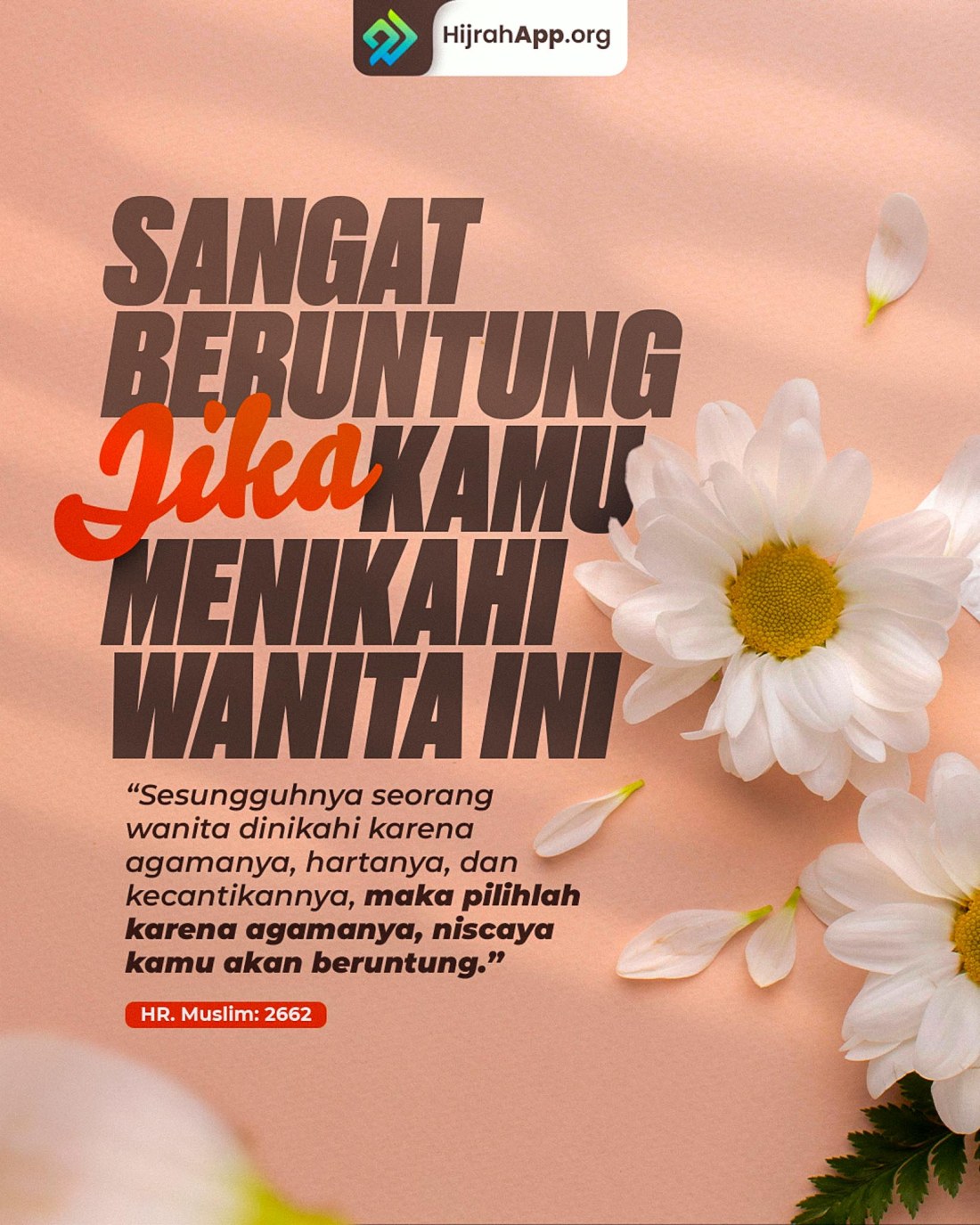 “Perempuan itu dinikahi karena empat faktor yaitu agama, martabat, harta dan kecantikannya. Pilihlah perempuan yang baik agamanya. Jika tidak, niscaya engkau akan menjadi orang yang merugi”.[3]