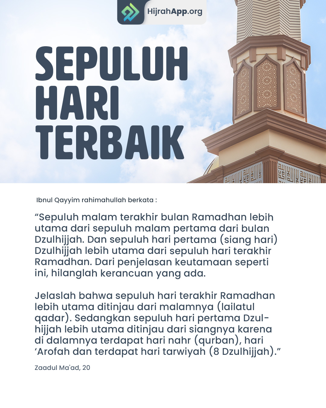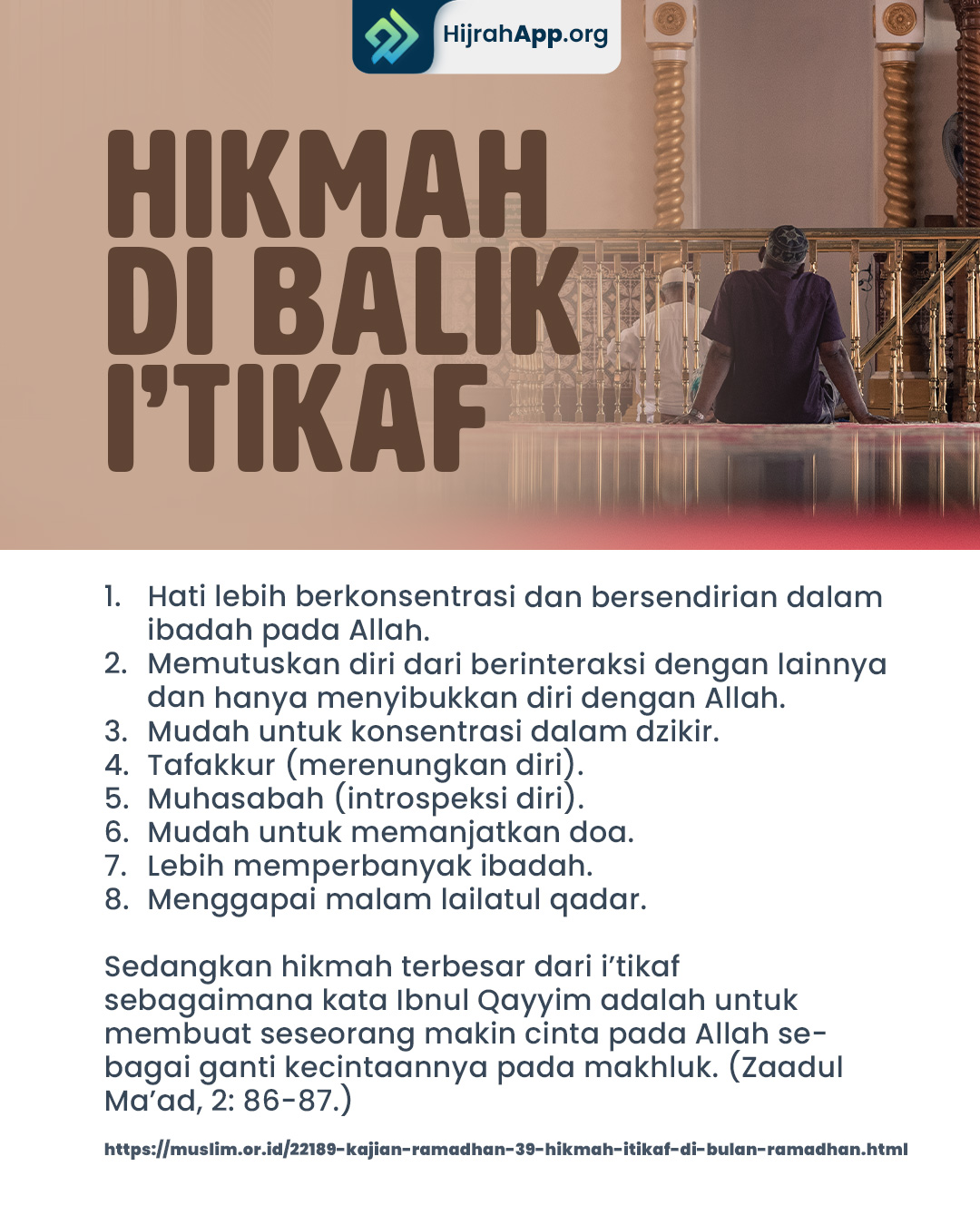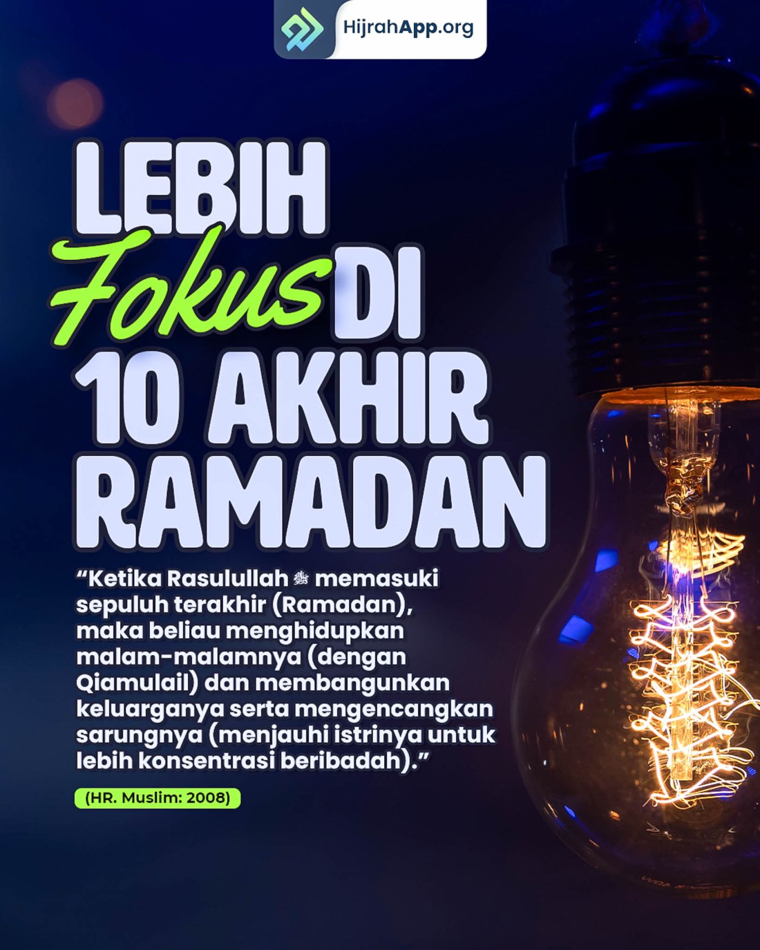 “Rasulullah shallallahu ‘alaihi wa sallam biasa ketika memasuki sepuluh hari terakhir dari bulan Ramadhan, beliau kencangkan sarungnya (bersungguh-sungguh dalam ibadah dengan meninggalkan istri-istrinya), menghidupkan malam-malam tersebut dengan ibadah, dan membangunkan keluarganya untuk beribadah.” (HR. Bukhari, no. 2024 dan Muslim, no. 1174).