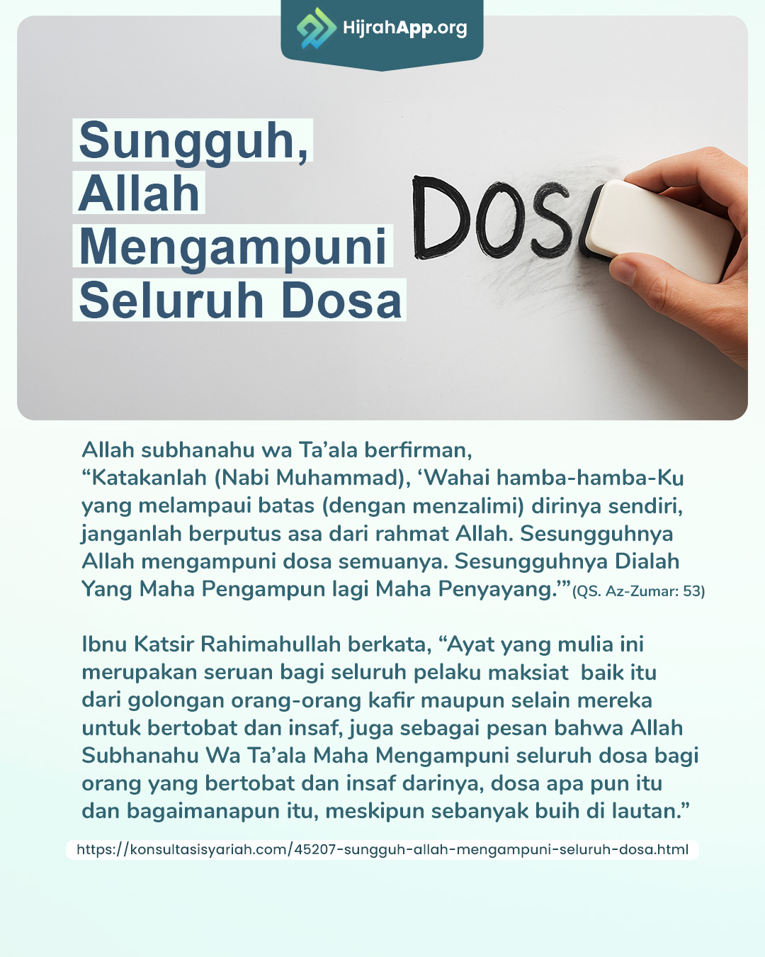 “Katakanlah: “Hai hamba-hamba-Ku yang malampaui batas terhadap diri mereka sendiri, janganlah kamu berputus asa dari rahmat Allah. Sesungguhnya Allah mengampuni dosa-dosa semuanya. Sesungguhnya Dialah Yang Maha Pengampun lagi Maha Penyayang. Dan kembalilah kamu kepada Tuhanmu, dan berserah dirilah kepada-Nya sebelum datang azab kepadamu kemudian kamu tidak dapat ditolong (lagi). Dan ikutilah sebaik-baik apa yang telah diturunkan kepadamu dari Tuhanmu sebelum datang azab kepadamu dengan tiba-tiba, sedang kamu tidak menyadarinya.” (QS:Az-Zumar | Ayat: 53-55).