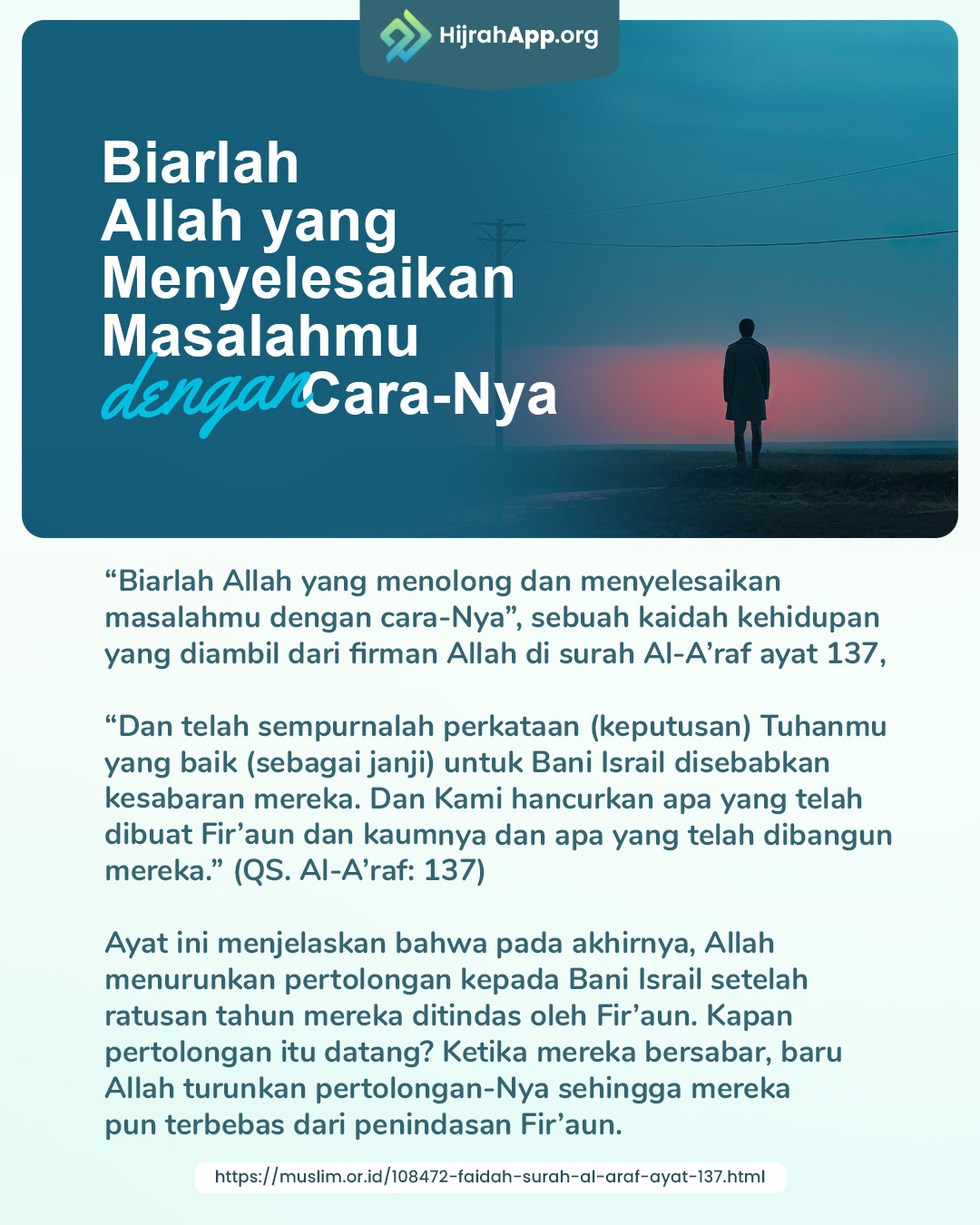 “Biarlah Allah yang menolong dan menyelesaikan masalahmu dengan cara-Nya”, sebuah kaidah kehidupan yang diambil dari firman Allah di surah Al-A’raf ayat 137,