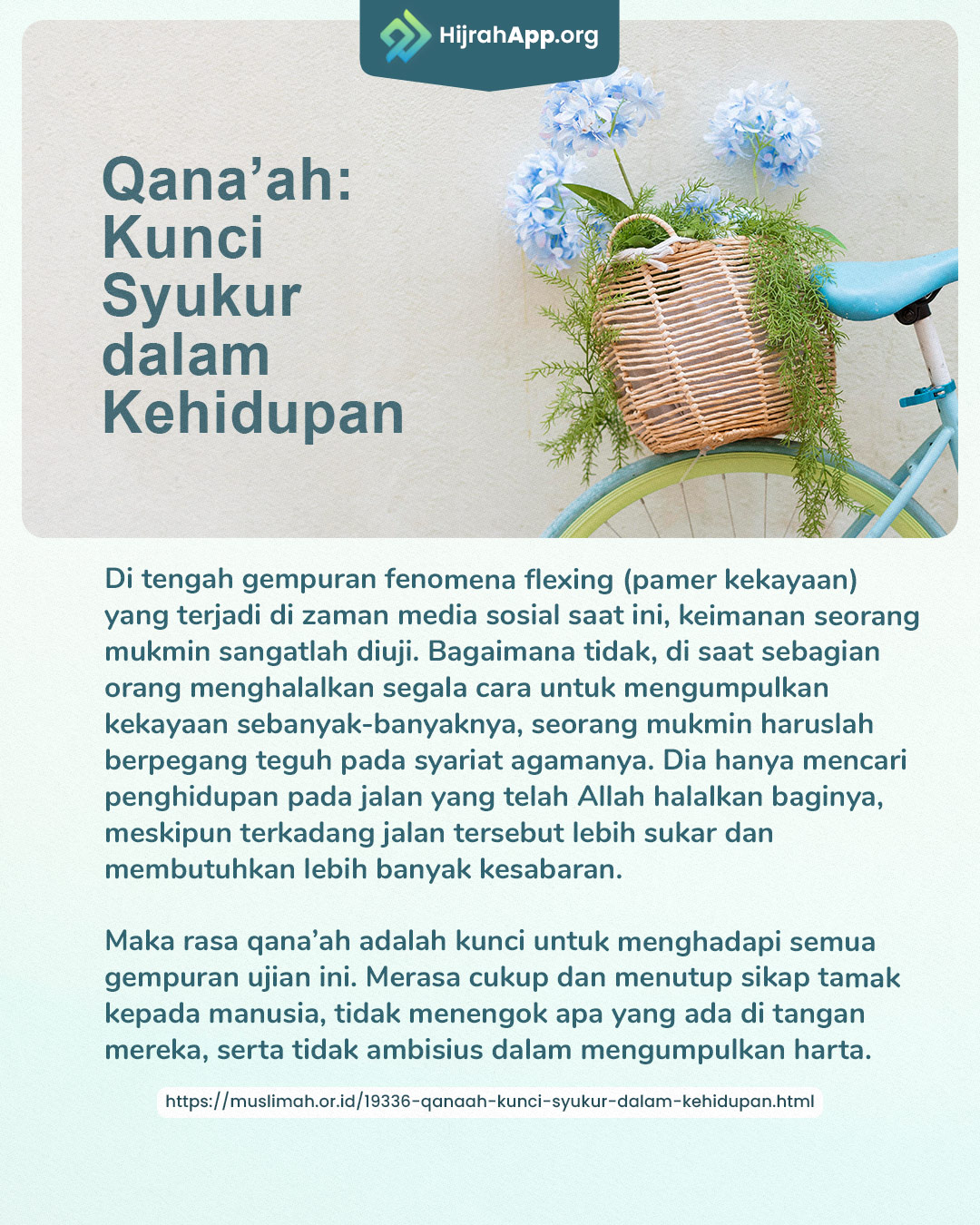 (Hakikat) kaya bukanlah dengan banyaknya harta benda, namun kaya (yang sebenarnya) adalah kaya hati (merasa ridha dan cukup dengan rezeki yang dikaruniakan)[12]