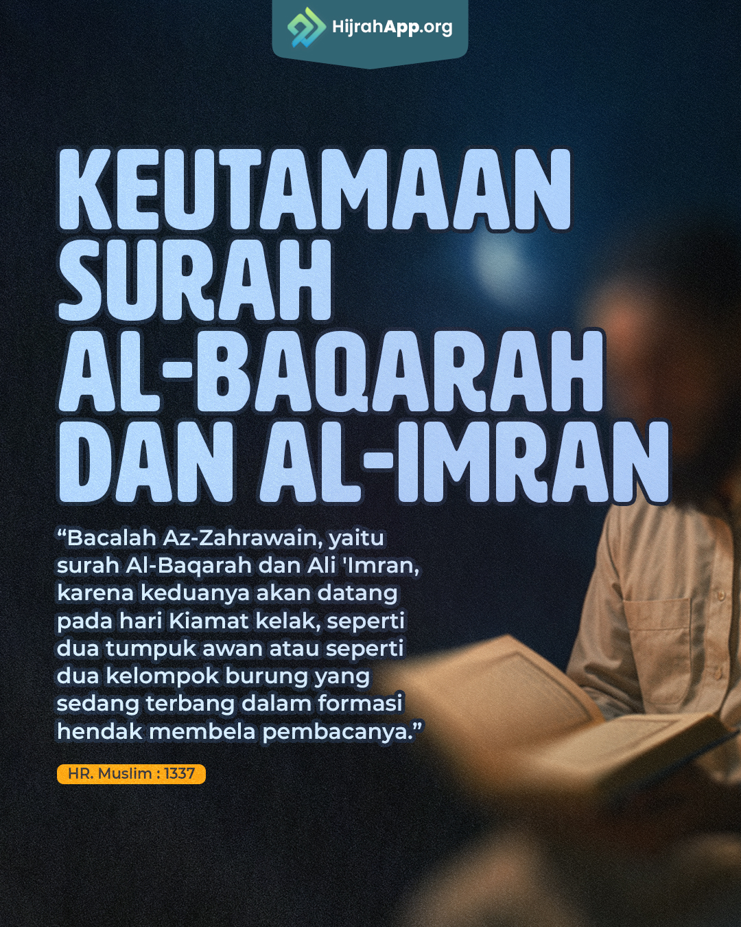 Dari An-Nawwas bin Sam’an radhiyallahu ‘anhu, ia berkata, “Aku mendengar Rasulullah shallallahu ‘alaihi wa sallam bersabda, ‘Pada hari kiamat, Al-Qur’an akan didatangkan dan juga para ahli Al-Qur’an yaitu orang-orang yang mengamalkannya di dunia. Didahului oleh surah Al-Baqarah dan Ali ‘Imran, keduanya menjadi hujjah bagi orang yang membacanya.” (HR. Muslim) [HR. Muslim, no. 805]