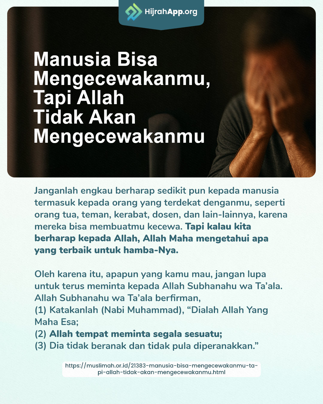 Sumber: https://muslimah.or.id/21383-manusia-bisa-mengecewakanmu-tapi-allah-tidak-akan-mengecewakanmu.html