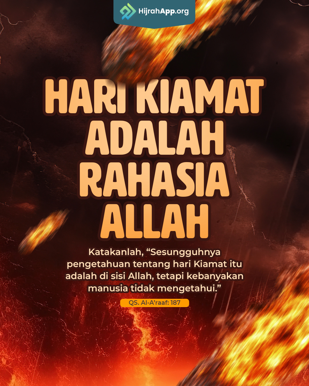 “Mereka bertanya kepadamu tentang Kiamat, ‘Kapankah terjadinya?’ Katakanlah, ‘Sesungguhnya pengetahuan tentang Kiamat itu adalah pada sisi Rabb-ku; tidak seorang pun yang dapat menjelaskan waktu kedatangannya selain Dia. Kiamat itu amat berat (huru-haranya bagi makhluk) yang di langit dan di bumi. Kiamat itu tidak akan datang kepadamu melainkan dengan tiba-tiba.’ Mereka bertanya kepadamu seakan-akan kamu benar-benar mengetahuinya. Katakanlah, ‘Sesungguhnya pengetahuan tentang hari Kiamat itu adalah di sisi Allah, tetapi kebanyakan manusia tidak mengetahui.’” [Al-A’raaf/7: 187]