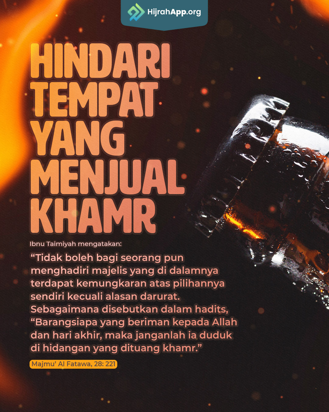 “Tidak boleh bagi seorang pun menghadiri majelis yang di dalamnya terdapat kemungkaran atas pilihannya sendiri kecuali alasan darurat. Sebagaimana disebutkan dalam hadits, “Barangsiapa yang beriman kepada Allah dan hari akhir, maka janganlah ia duduk di hidangan yang dituangkan khomr.” (Majmu’ Al Fatawa, 28: 221).