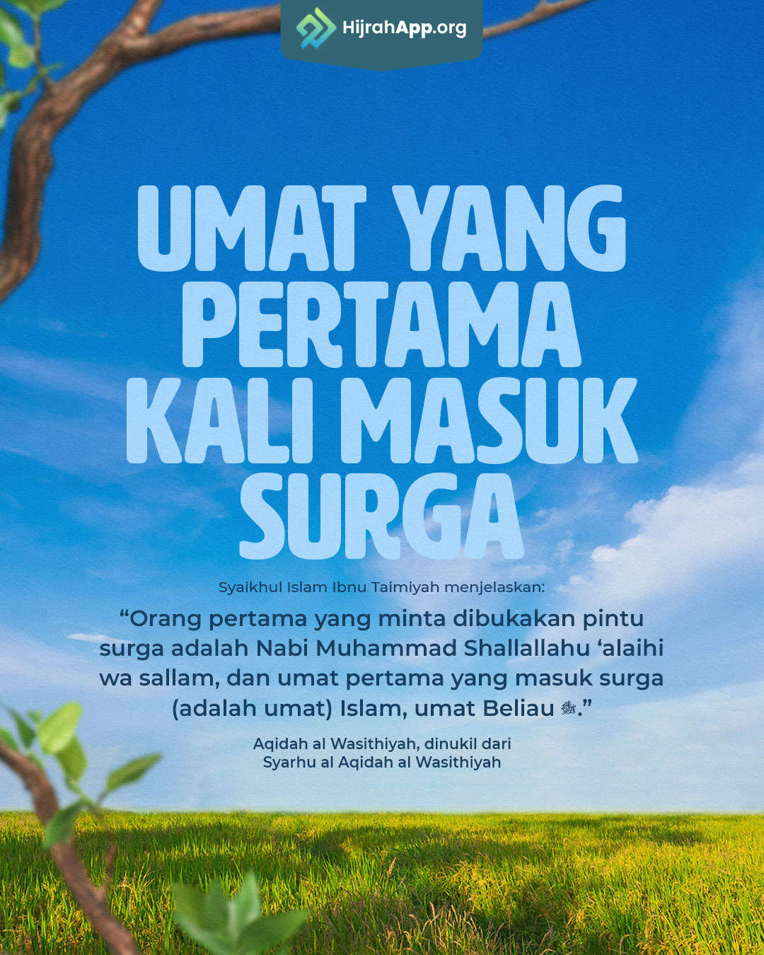 Oleh karena itu Syaikhul Islam Ibnu Taimiyah saat menjelaskan tentang aqidah Ahlu Sunnah, beliau rahimahullah mengatakan, orang pertama yang minta dibukakan pintu surga adalah Muhammad Shallallahu ‘alaihi wa sallam , dan umat pertama yang masuk surga (adalah umat) Islam, umat Beliau Shallallahu ‘alaihi wa sallam “. [1]