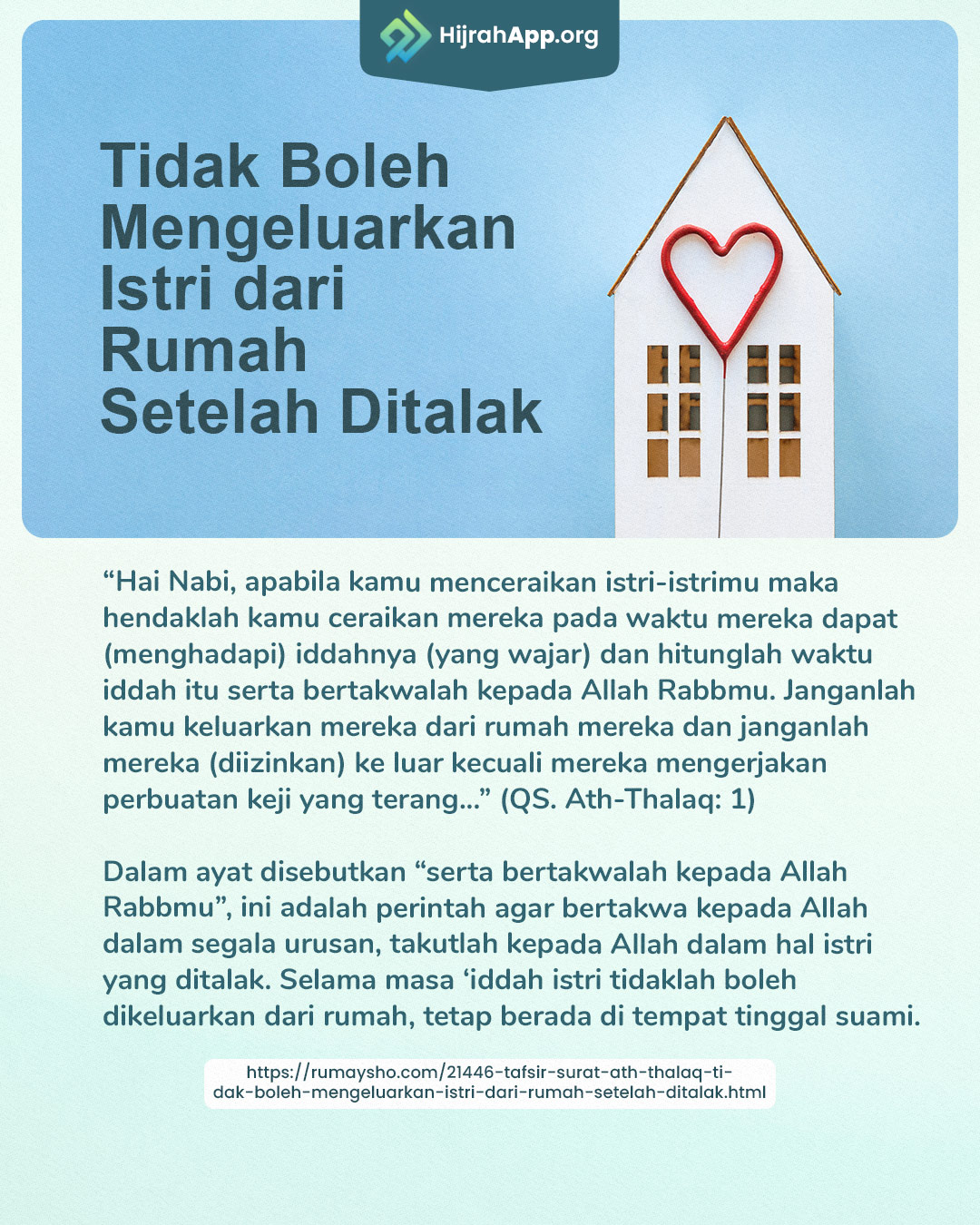 “Hai Nabi, apabila kamu menceraikan istri-istrimu maka hendaklah kamu ceraikan mereka pada waktu mereka dapat (menghadapi) iddahnya (yang wajar) dan hitunglah waktu iddah itu serta bertakwalah kepada Allah Rabbmu. Janganlah kamu keluarkan mereka dari rumah mereka dan janganlah mereka (diizinkan) ke luar kecuali mereka mengerjakan perbuatan keji yang terang. Itulah hukum-hukum Allah dan barangsiapa yang melanggar hukum-hukum Allah, maka sesungguhnya dia telah berbuat zalim terhadap dirinya sendiri. Kamu tidak mengetahui barangkali Allah mengadakan sesudah itu sesuatu hal yang baru.” (QS. Ath-Thalaq: 1)