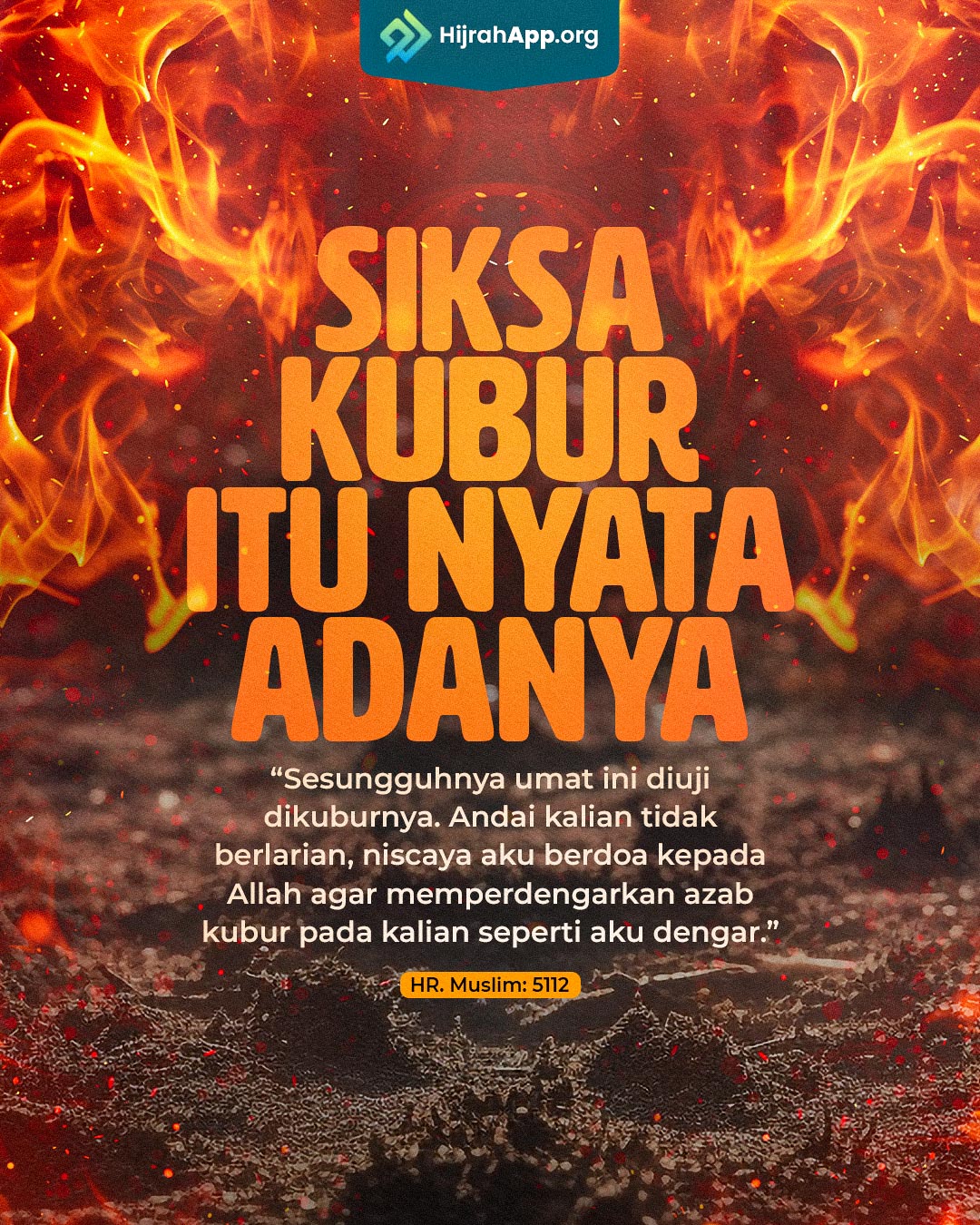 “Suatu ketika seseorang sedang berjalan di atas kendaraan di antara Mekah dan Madinah, kebetulan melewati kuburan. Tiba-tiba ada seseorang keluar dari kuburan dengan api yang menyala, dibelenggu dengan besi, dan di lehernya terdapat rantai. Ia menarik-narik rantai itu, lalu ia berkata, “Wahai hamba Allah! Siramkanlah air! Wahai hamba Allah! Siramkanlah air!” Lantas ada orang lain yang keluar mengikutinya, lalu ia berkata, “Wahai hamba Allah! Jangan kau sirami air! Wahai hamba Allah! Jangan kau sirami air!” kemudian ia menarik rantai, lalu mengembalikannya ke dalam kubur.’