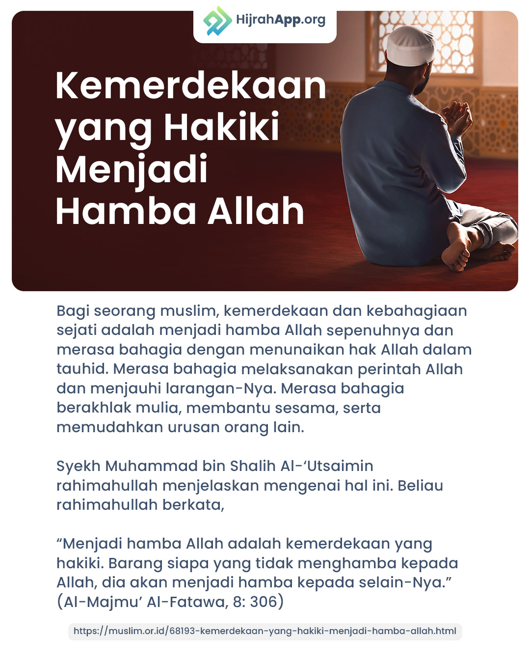 “Menjadi hamba Allah adalah kemerdekaan yang hakiki. Barangsiapa yang tidak menghamba kepada Allah, dia akan menjadi hamba kepada selain-Nya.” (Al-Majmu’ Al-Fatawa, 8: 306)