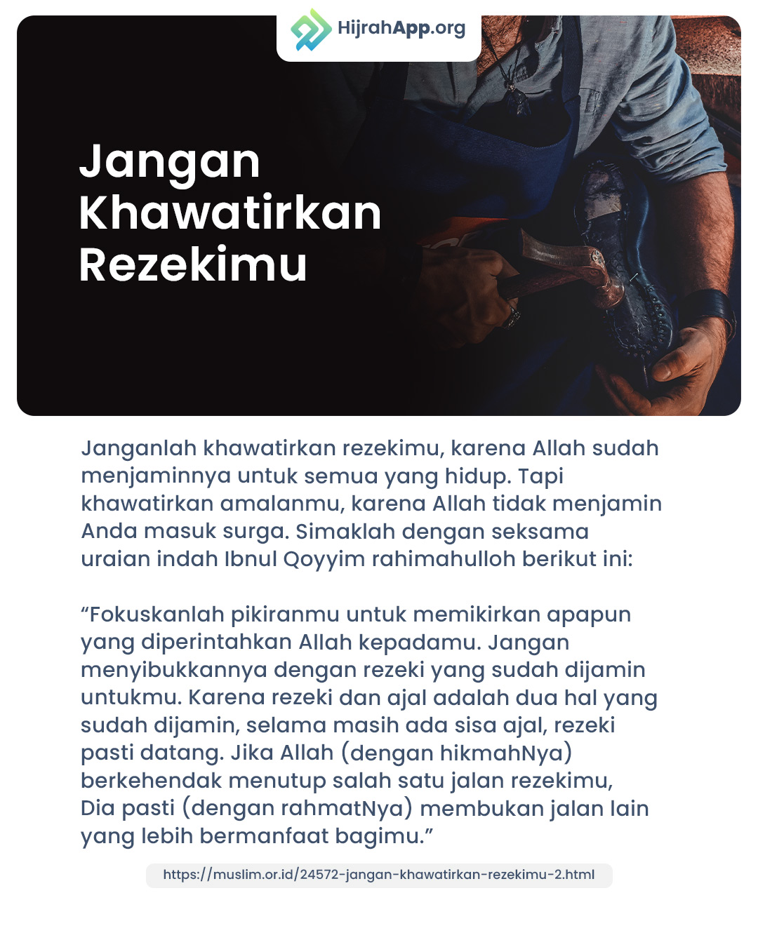 “Fokuskanlah pikiranmu untuk memikirkan apapun yang diperintahkan Allah kepadamu. Jangan menyibukkannya dengan rezeki yang sudah dijamin untukmu. Karena rezeki dan ajal adalah dua hal yang sudah dijamin, selama masih ada sisa ajal, rezeki pasti datang. Jika Allah -dengan hikmahNya- berkehendak menutup salah satu jalan rezekimu, Dia pasti -dengan rahmatNya- membukan jalan lain yang lebih bermanfaat bagimu.