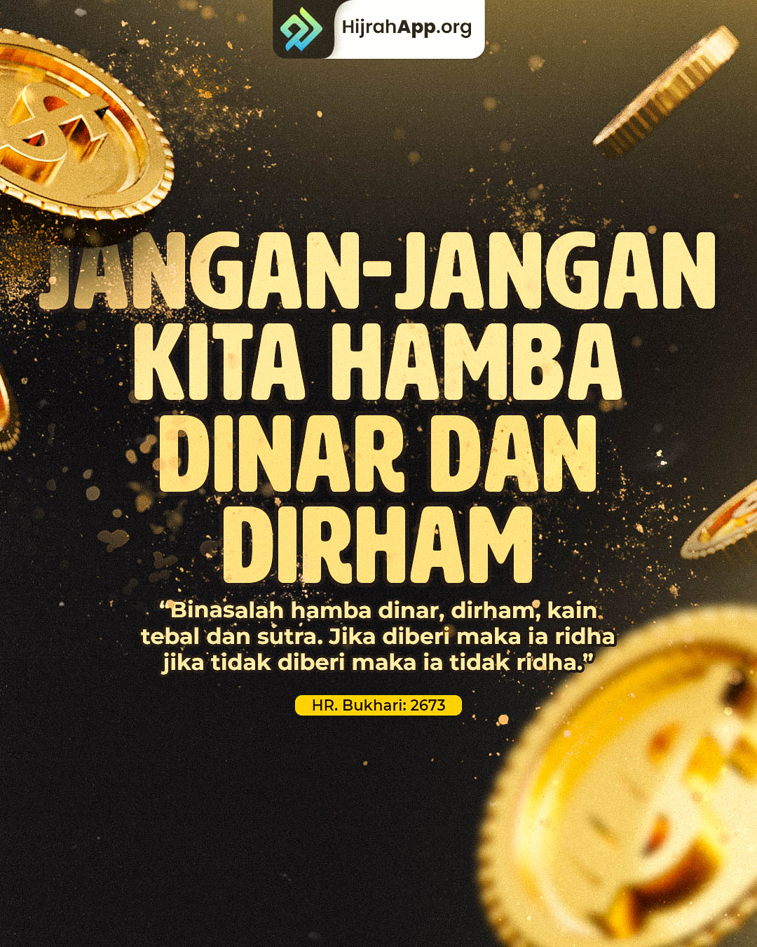 “Celakalah hamba dinar, celakalah hamba dirham, celakalah hamba khamisah dan khamilah (sejenis pakaian yang terbuat dari wool/sutera). Jika diberi ia senang, tetapi jika tidak diberi ia marah”.[HR. Bukhari]