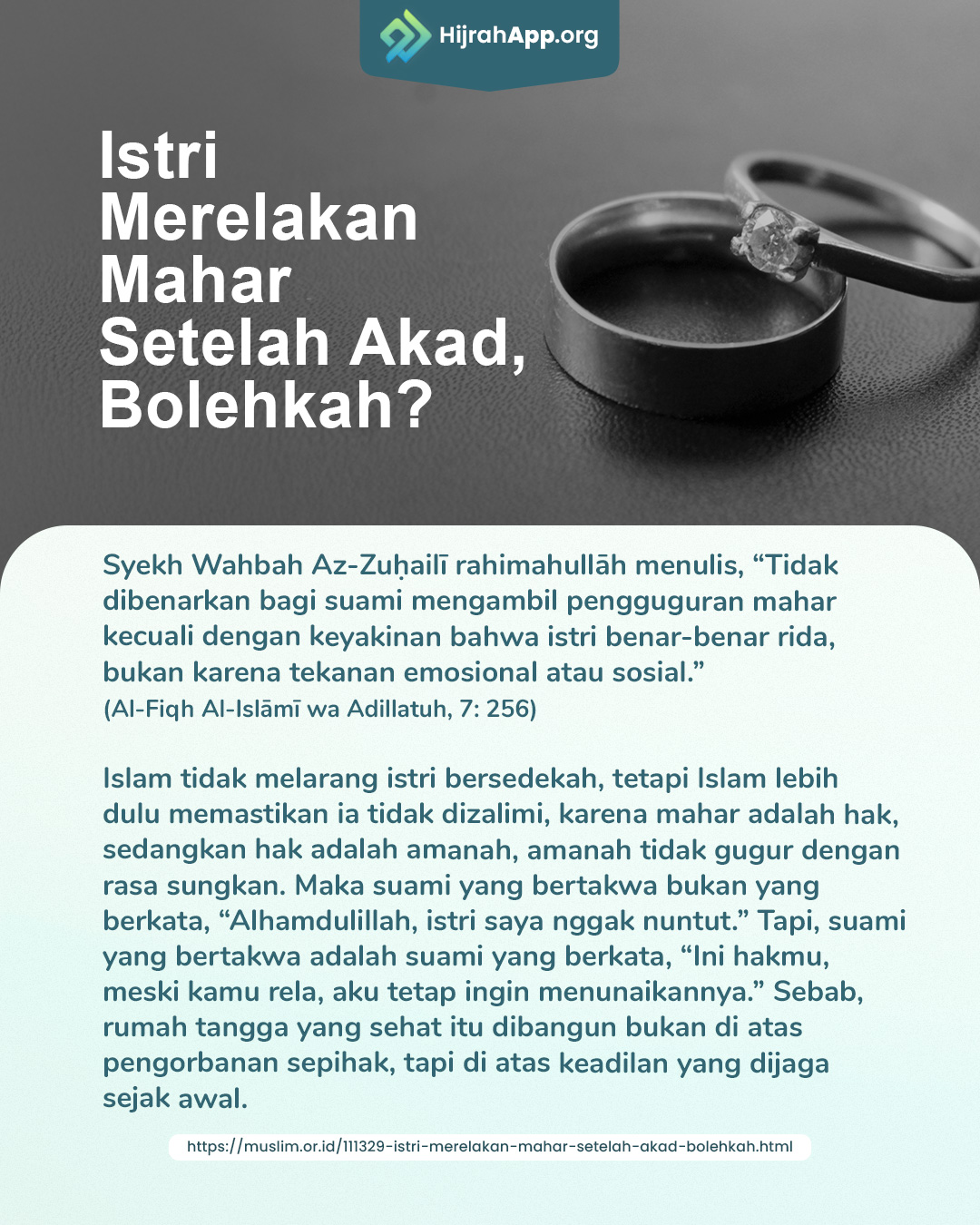 Syekh Wahbah Az-Zuḥailī rahimahullāh menulis, “Tidak dibenarkan bagi suami mengambil pengguguran mahar kecuali dengan keyakinan bahwa istri benar-benar rida, bukan karena tekanan emosional atau sosial.” (Al-Fiqh Al-Islāmī wa Adillatuh, 7: 256)