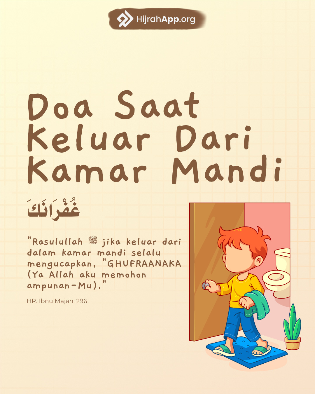 “Nabi shallallahu ‘alaihi wasallam biasa bila keluar dari toilet beliau mengucapkan doa “Ghufroonaka” (artinya: Ya Allah, hamba memohon ampunan Mu.” (HR. Abu Dawud)