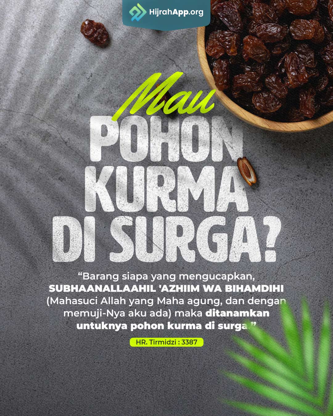 Diriwayatkan dari Jabir radhiyallahu ‘anhu, Nabi shallallahu ‘alaihi wa sallam bersabda, “Barangsiapa yang mengucapkan, ‘SUBHANALLOH WA BIHAMDIH’ (Mahasuci Allah dan dengan memuji-Nya), maka ditanamkan untuknya satu pohon kurman di surga.” (HR. Tirmidzi, ia mengatakan bahwa hadits ini hasan) [HR. Tirmidzi, no. 3464. Syaikh Salim bin ‘Ied Al-Hilaly menyatakan bahwa hadits ini shahih dengan syawahidnya, yaitu penguatnya]