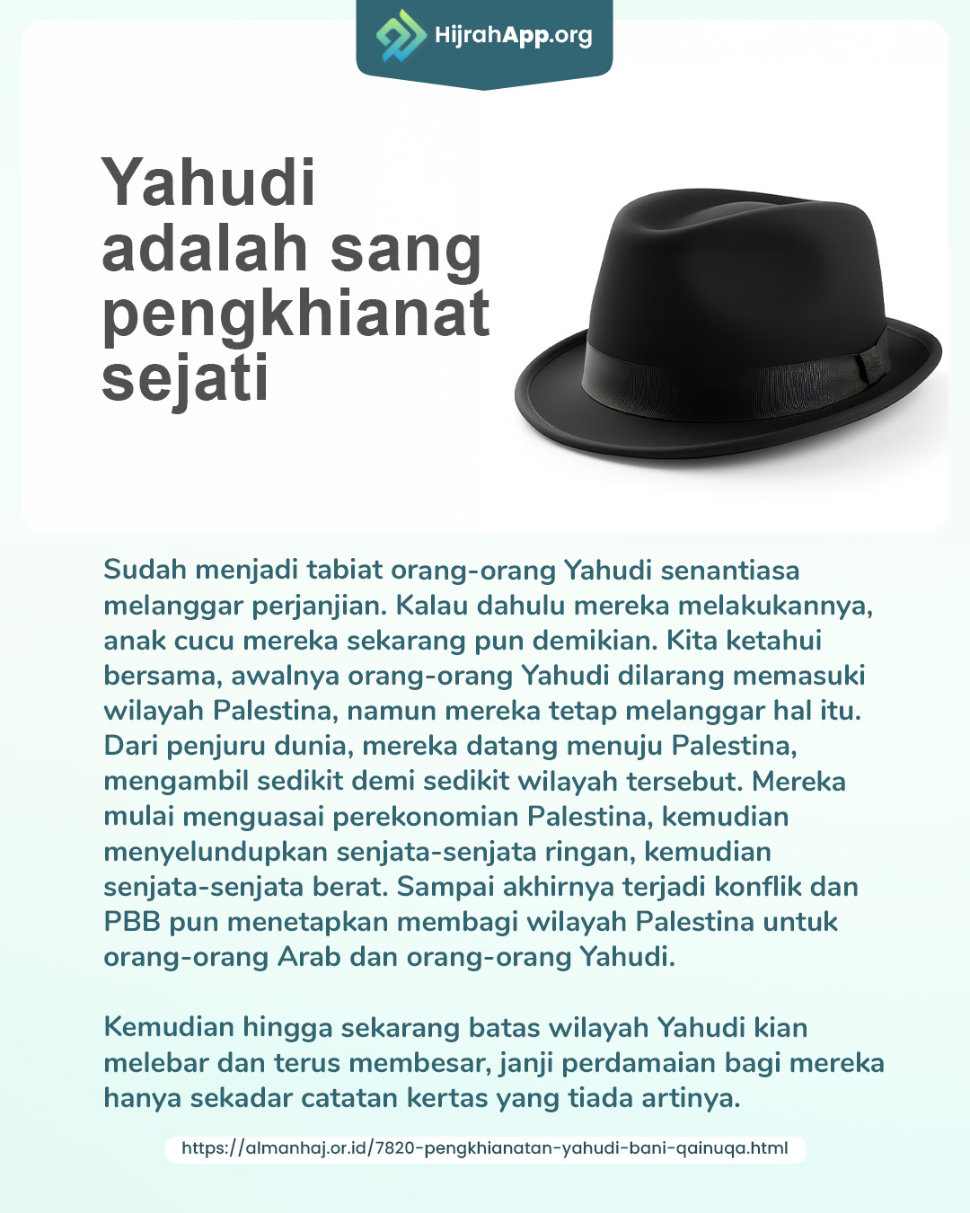 Sudah menjadi tabiat orang-orang Yahudi senantiasa melanggar perjanjian. Kalau dahulu mereka melakukannya, anak cucu mereka sekarang pun demikian. Kita ketahui bersama, awalnya orang-orang Yahudi dilarang memasuki wilayah Palestina, namun mereka tetap melanggar hal itu. Dari penjuru dunia, mereka datang menuju Palestina, mengambil sedikit demi sedikit wilayah tersebut. Mereka mulai menguasai perekonomian Palestina, kemudian menyelundupkan senjata-senjata ringan, kemudian senjata-senjata berat. Sampai akhirnya terjadi konflik dan PBB pun menetapkan membagi wilayah Palestina untuk orang-orang Arab dan orang-orang Yahudi.