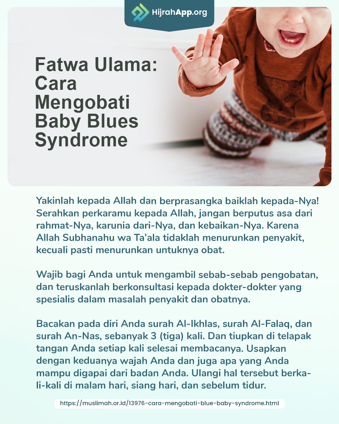 Aku adalah seorang pemudi di berusia 20-an. Saya muslimah multazimah dan telah menikah sekitar satu setengah tahun. Alhamdulillah kami telah diberi rizki sekitar 6 (enam) bulan berupa seorang anak laki-laki. Persalinanku berjalan normal, Alhamdulillah. Sekitar satu pekan setelah melahirkan, aku merasa sangat tertekan yang belum pernah menimpaku sebelumnya. Sehingga aku tidak memiliki semangat untuk mengurus apapun termasuk bayiku.